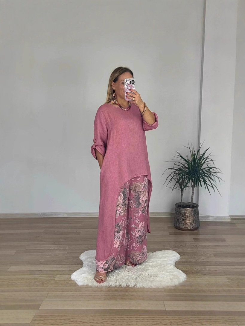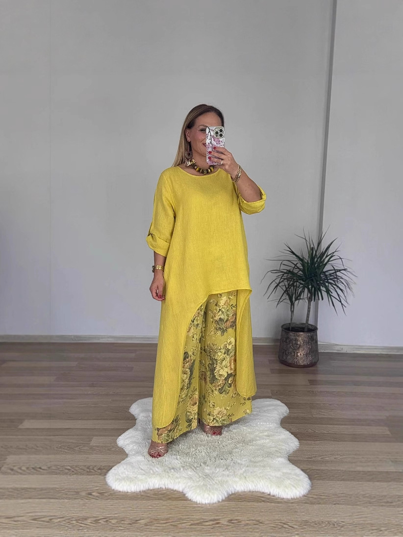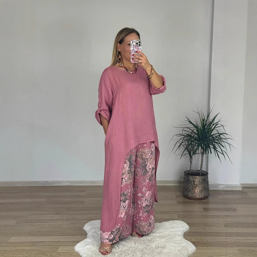 Ensemble femme blouse asymétrique coton lin + pantalon large fluide 2025