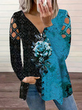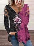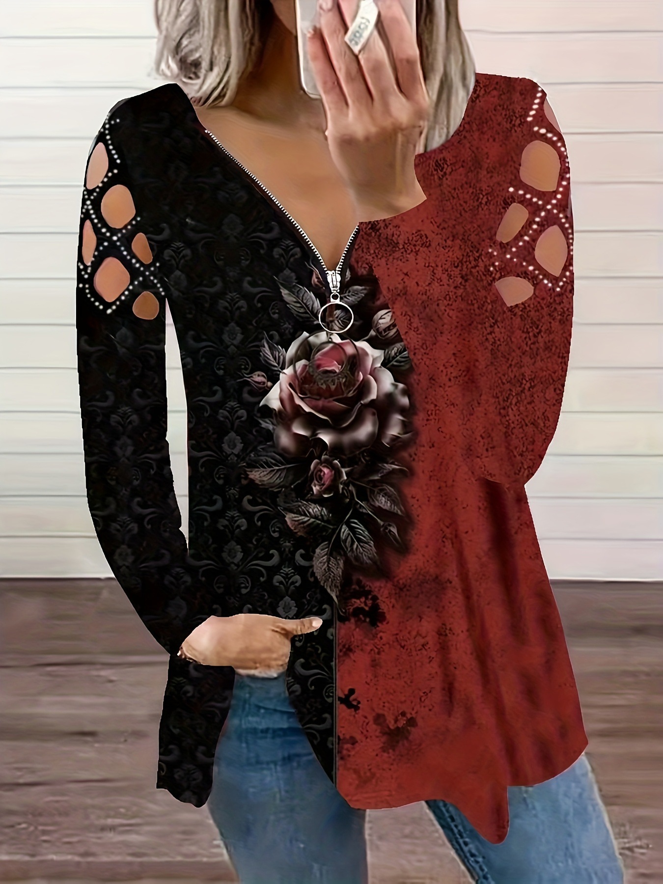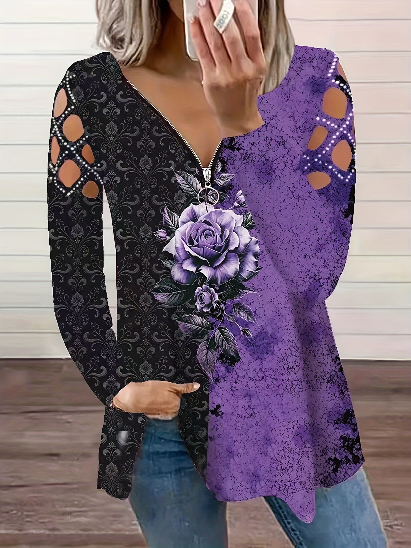 Haut femme manches longues imprimé rose fermeture éclair col V strass ajouré 2025