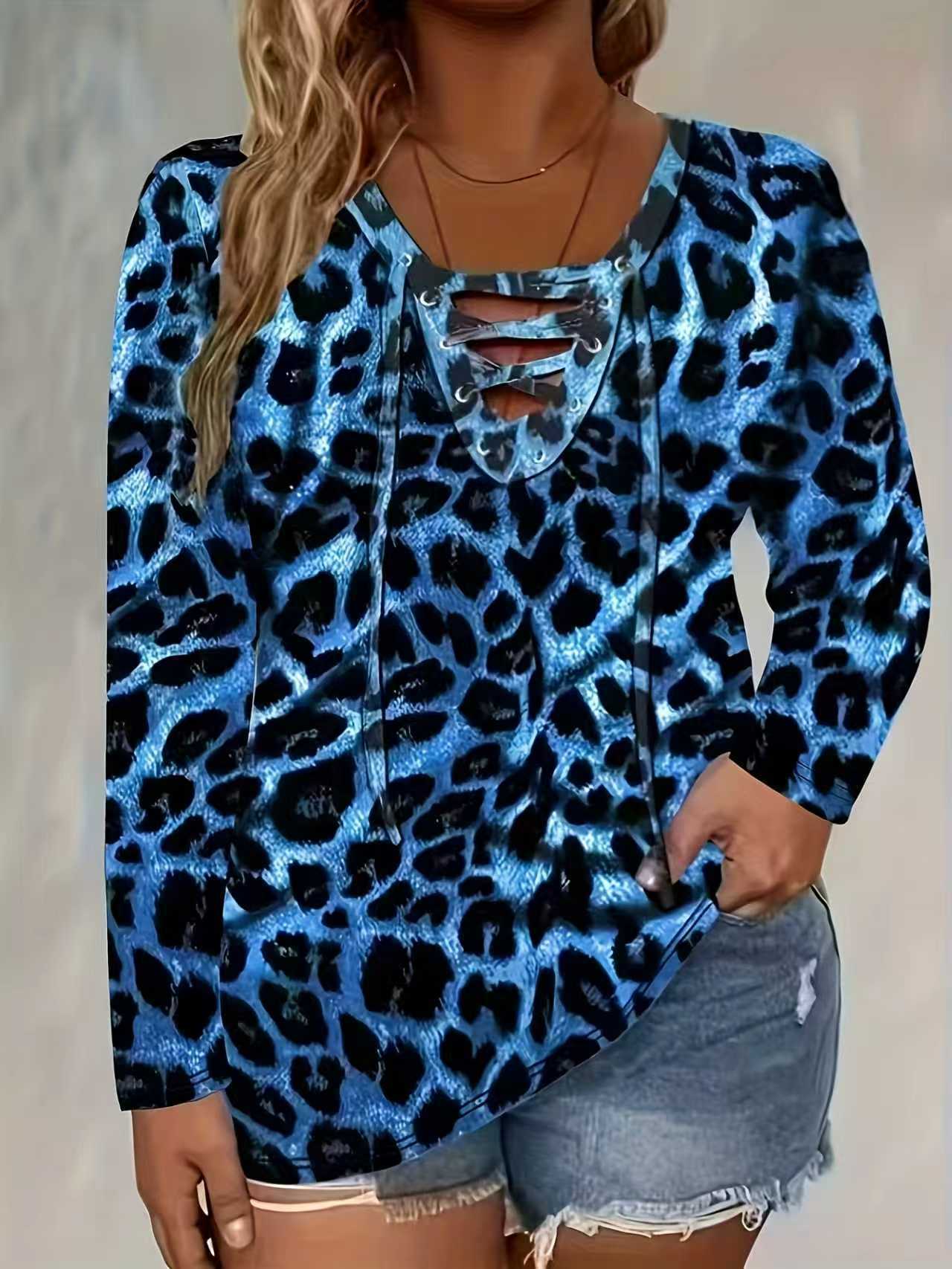 T-shirt femme grande taille manches longues col V imprimé léopard fashion 2025