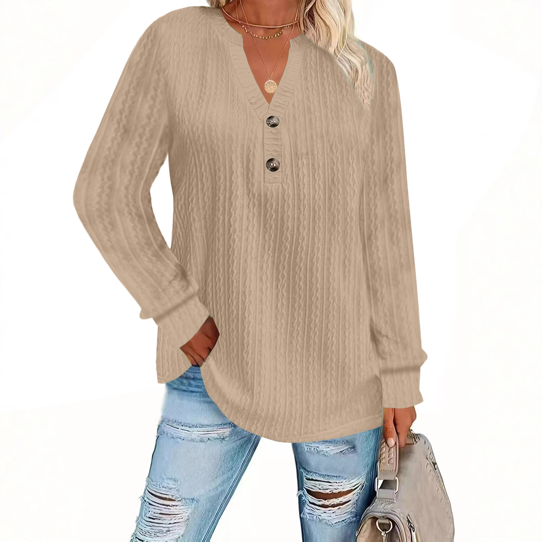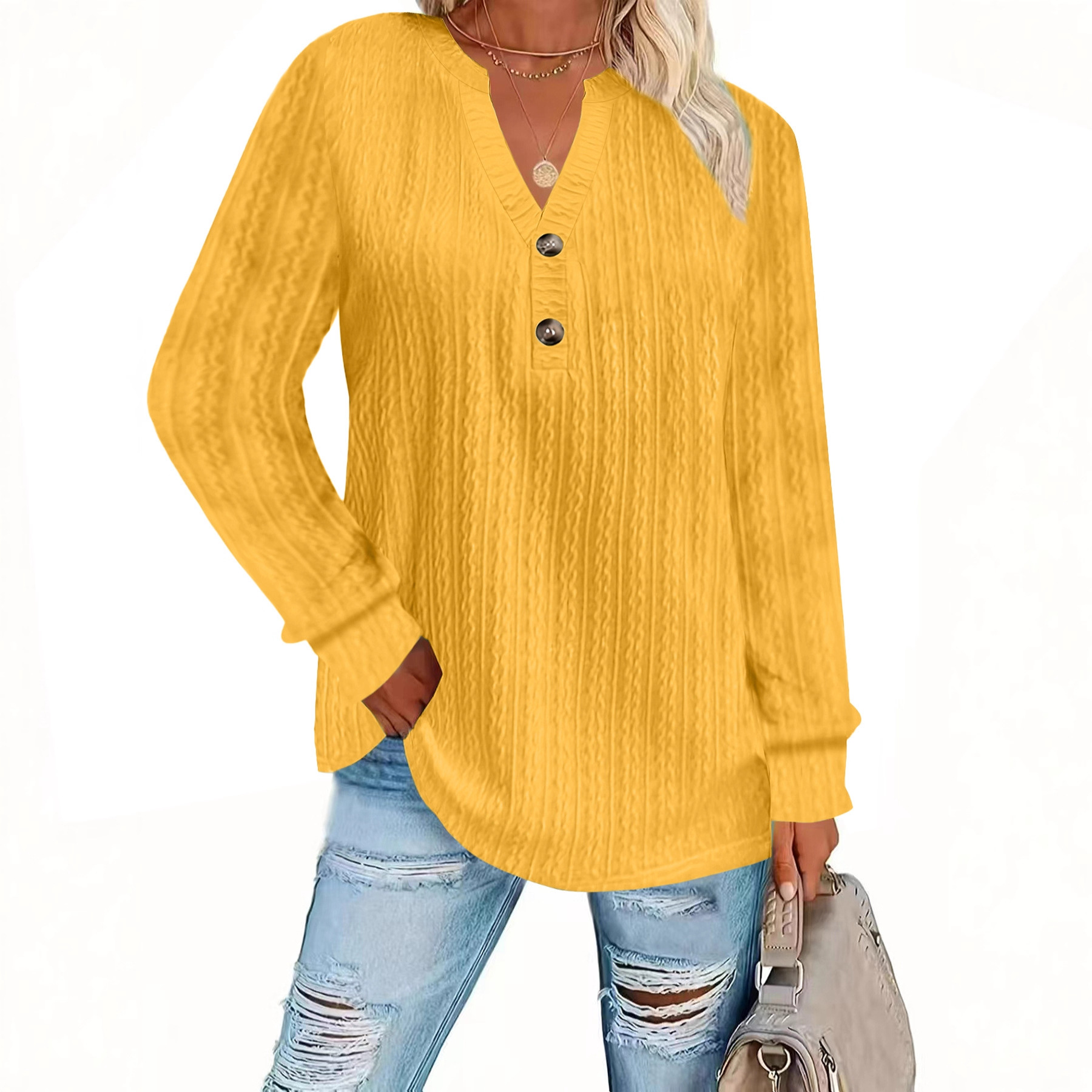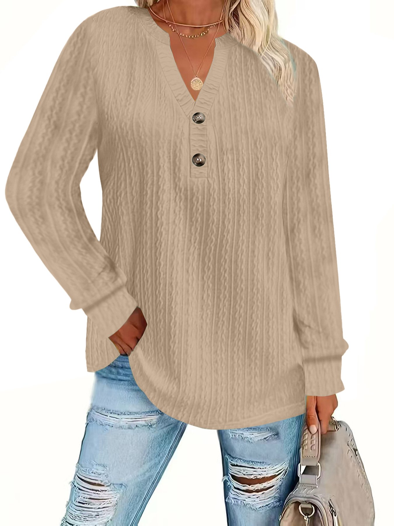 T-shirt femme tricot manches longues col V uni boutons élégant et confortable 2025